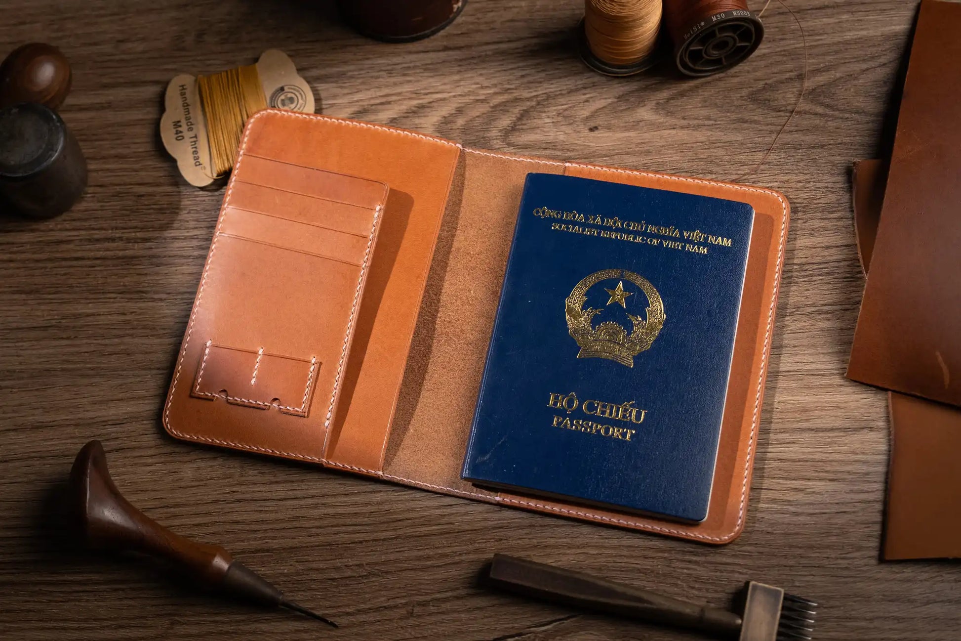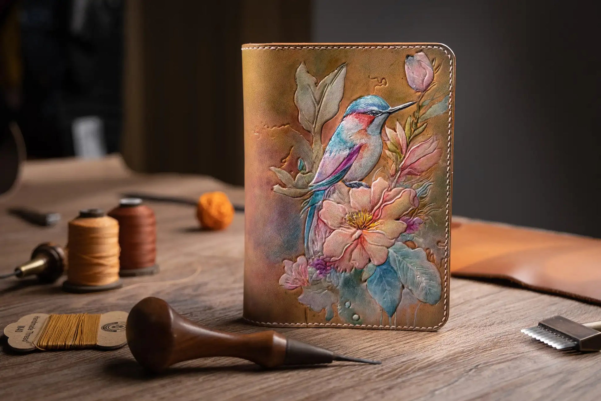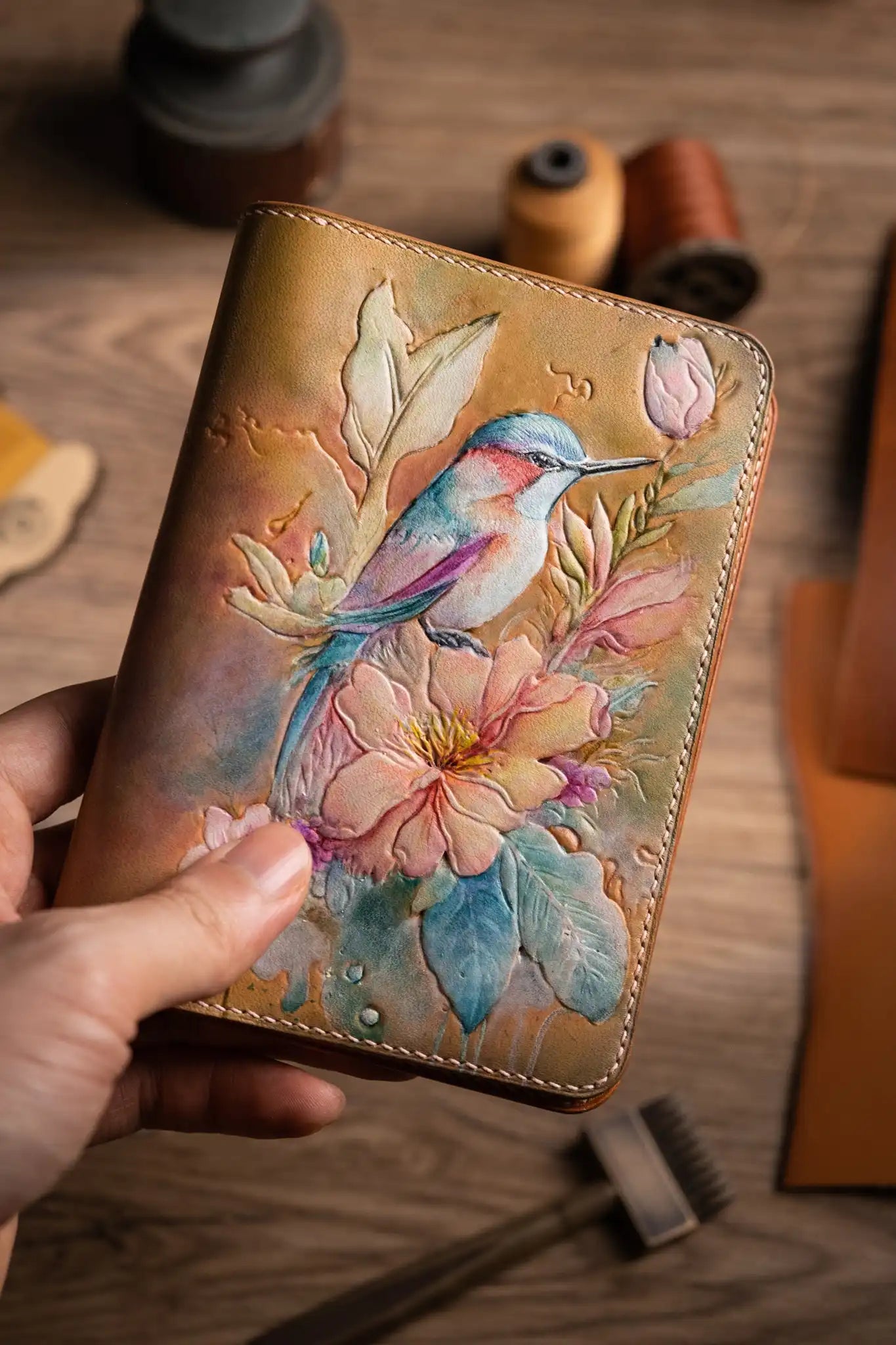 The KitArt Leather Passport Cover is a handcrafted leather travel accessory made from premium vegetable-tanned cowhide. Featuring hand-carved bird and floral motifs with hand-applied coloring, each piece reflects refined artistry and long-lasting durability.